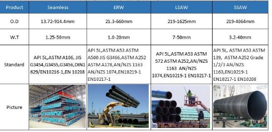 Seamless Steel Pipe, ERW Pipe, SSAW Pipe, LSAW Pipe, Oil Casing & Tubing, Drill Pipe, Galvanized Steel Pipe and Scaffolding Steel Pipe, Below is the detailed information.